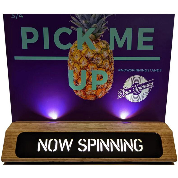 Ce présentoir de signe de LED est fait de bois et PVC avec l'éclairage de LED. Il y a deux lumières de LED sur la base pour accentuer le graphique de PVC. En outre, vous pouvez changer les lettres dans l'avant, qui sont également éclairées à contre-jour. Le graphique de PVC est interchangeable, ainsi la taille de emballage est petite.